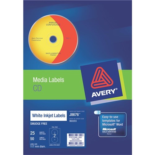 AVERY J8676-25 MEDIA LABELS Inkjet 2Lbl/Sht Fullface CD/DV Pk/50