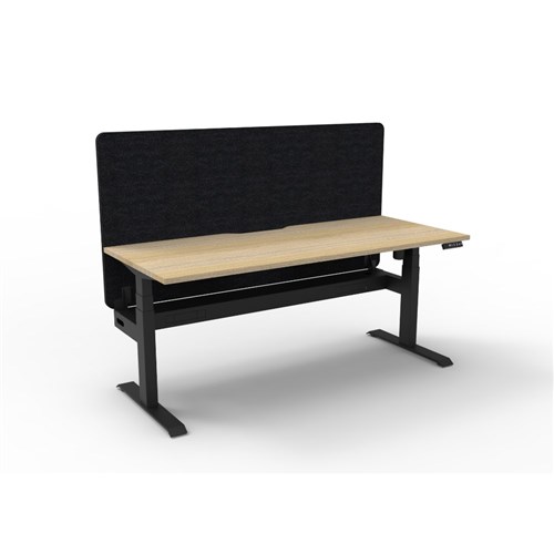 • Electric height adjustable single sided workstation with Natural Oak top and Black Satin frame, Black Eco screen and cable tray.