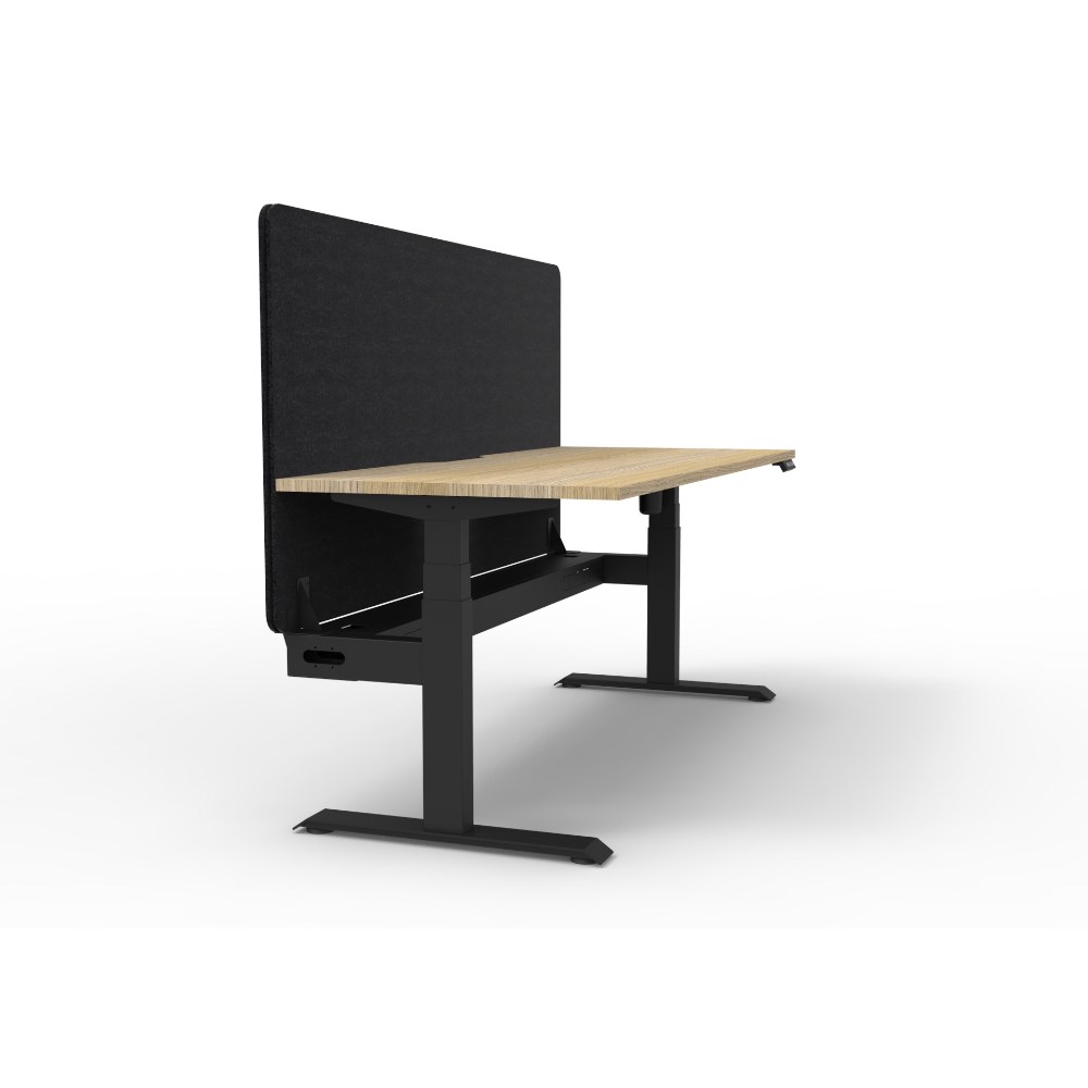 • Electric height adjustable single sided workstation with Natural Oak top and Black Satin frame, Black Eco screen and cable tray.