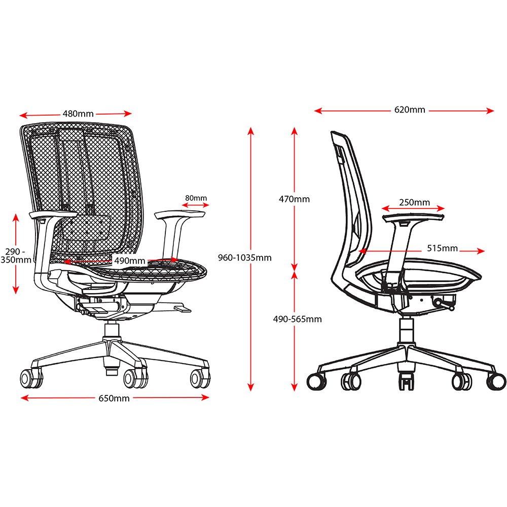 • Chair Dimensions: Seat 490W x 515D x Seat 470-540mmH. Overall height: 1150-1220mmH.